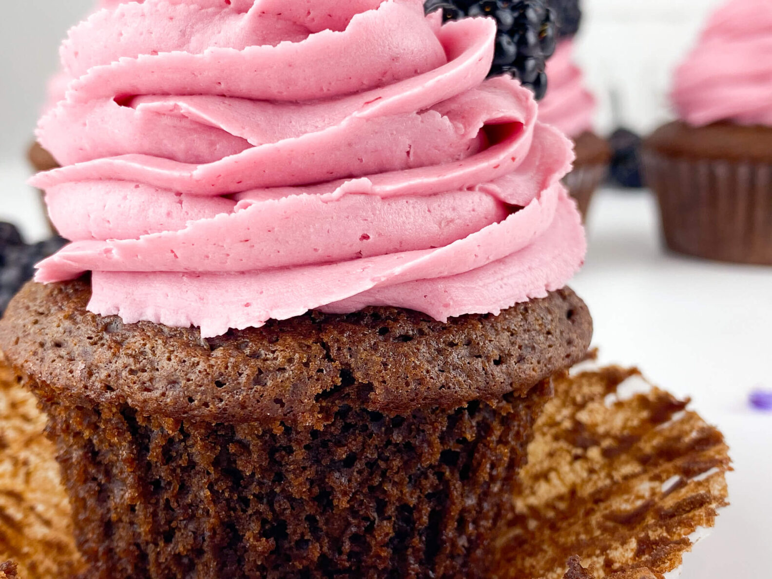 Chocolate and fruit are a combo that we all love in our family and this recipe did not disappoint. Our chocolate cupcakes were topped with a blackberry frosting that is easy to make and also makes for a beautiful all-naturally coloring.