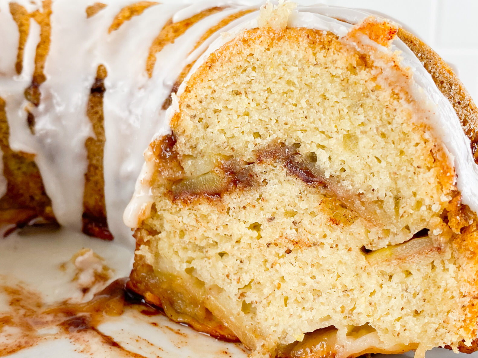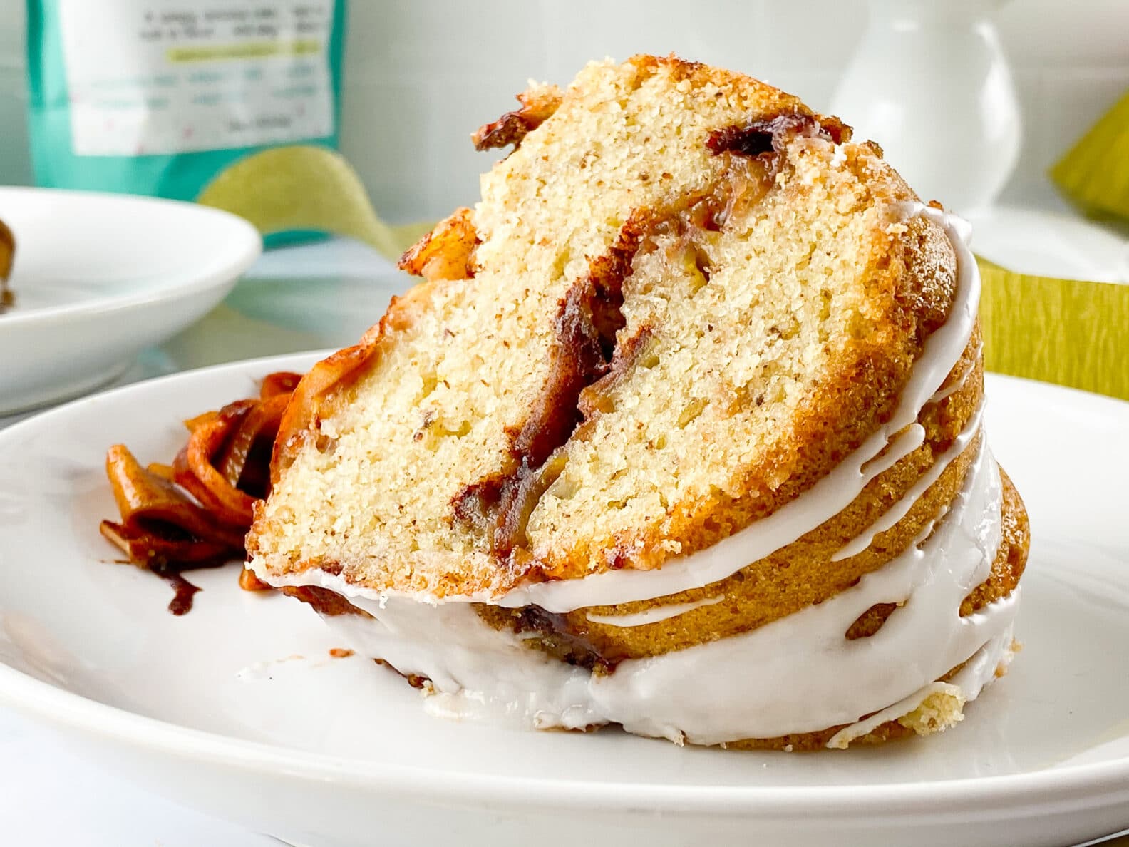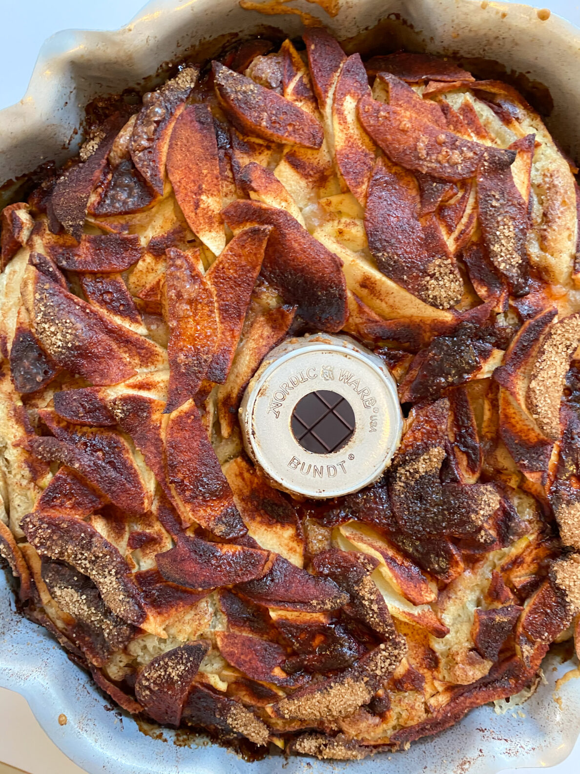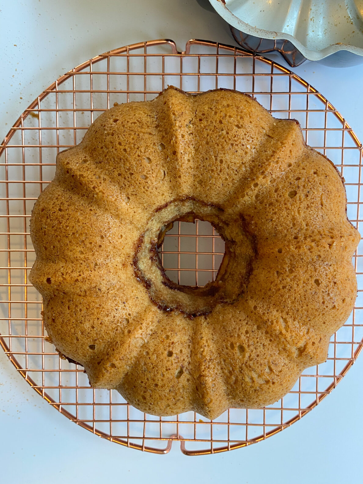 - Remove the pan from the oven and set on a safe surface to cool and set for 20-30 minutes. Place a wire cooling rack on top of the pan and then carefully flip the cake onto the cooling rack so that the rack is now on the bottom beneath the pan. Carefully and gently lift the pan the apple cake. If you are not glazing the cake you can slice and enjoy at this time. If you are using the glaze see the remaining recipe instructions below.