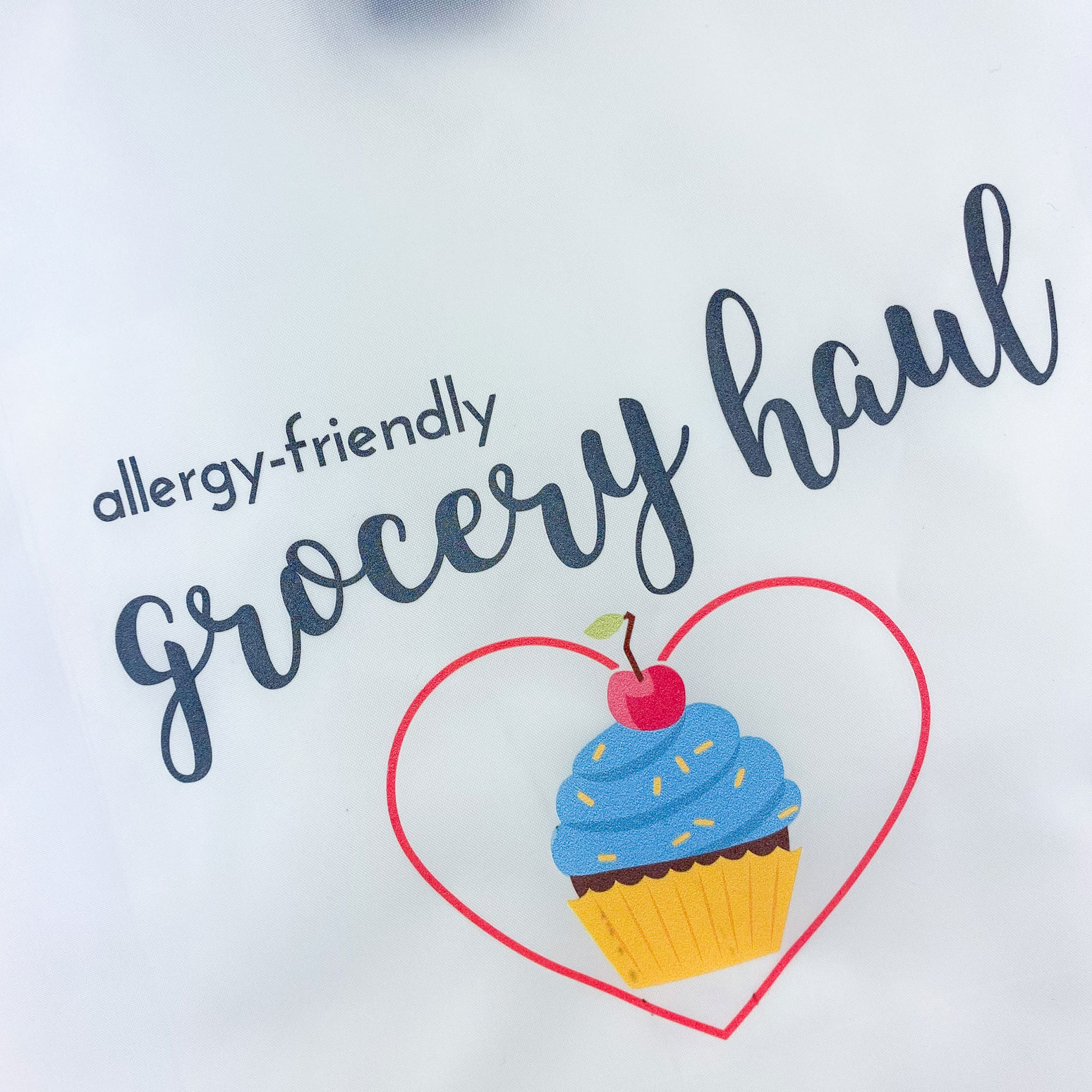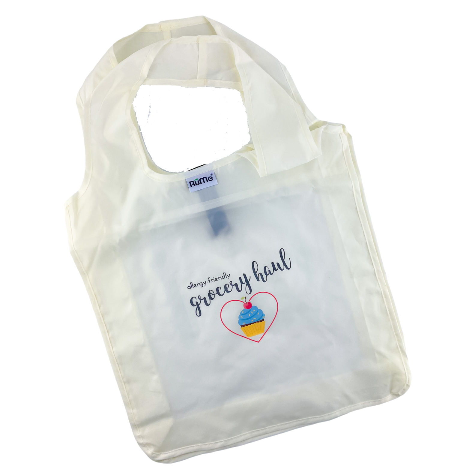 Make eco easy and beautiful with this medium size classic RuMe custom tote bag printed with our fun cupcake logo in a heart and “allergy-friendly grocery haul” written on the front side this bag. Great for your next shopping trip – and don’t forget to pick up the ingredients you’ll need for our baking mixes!