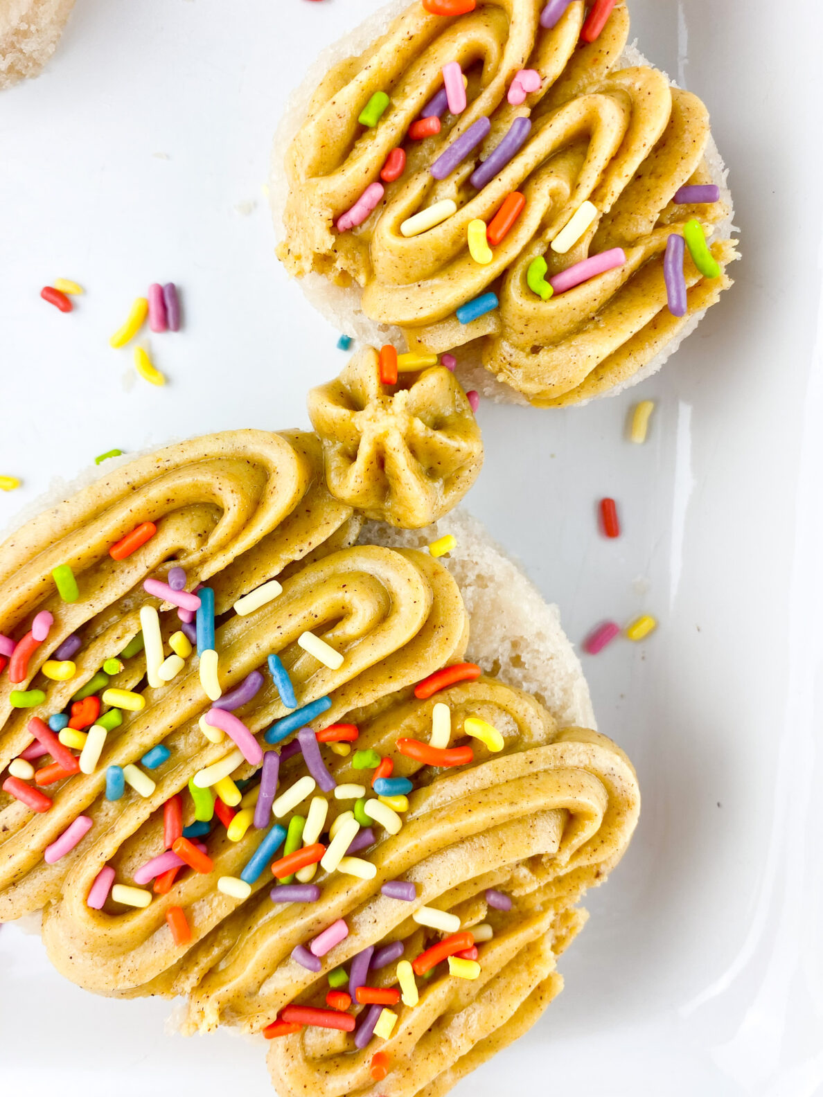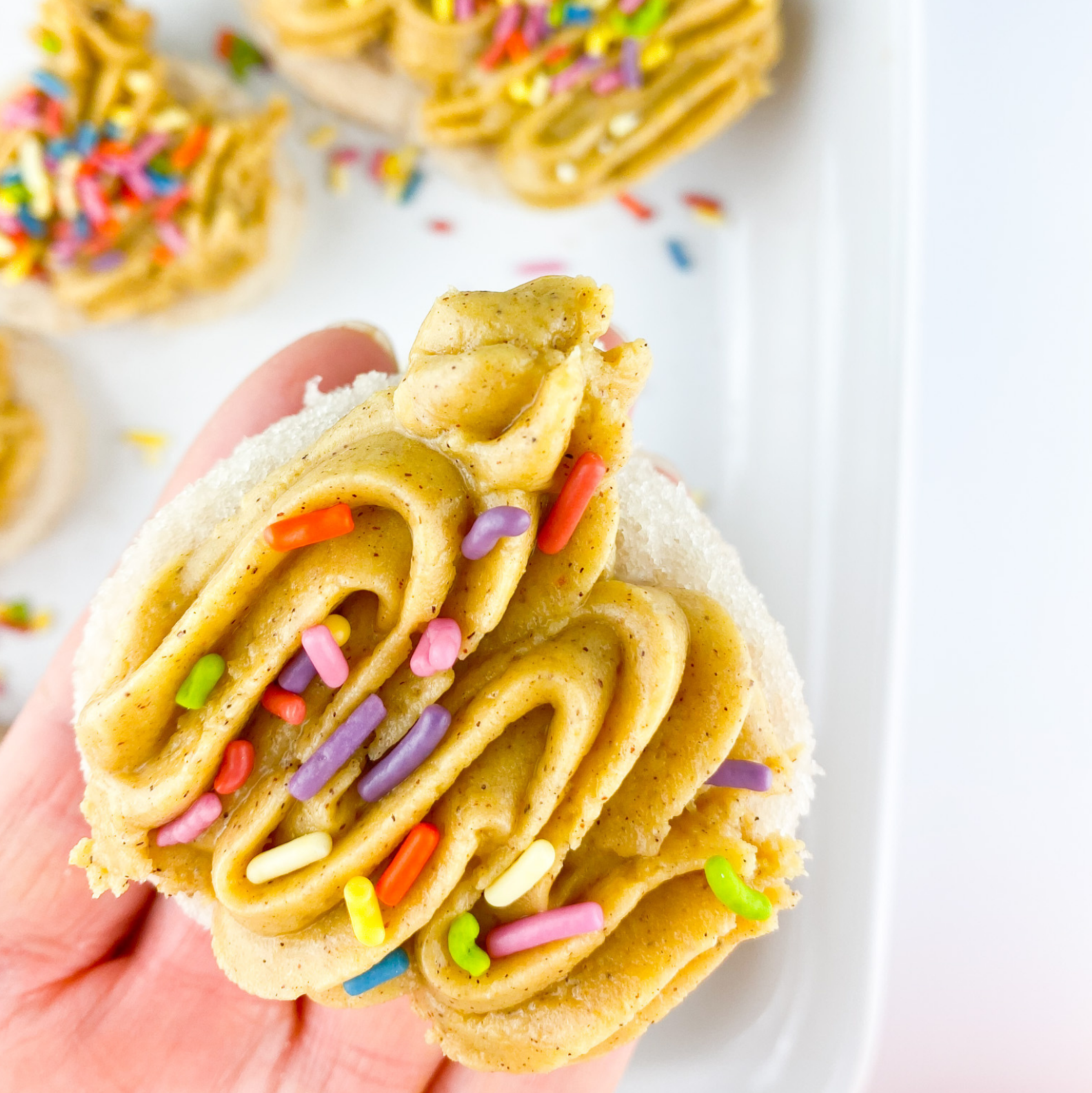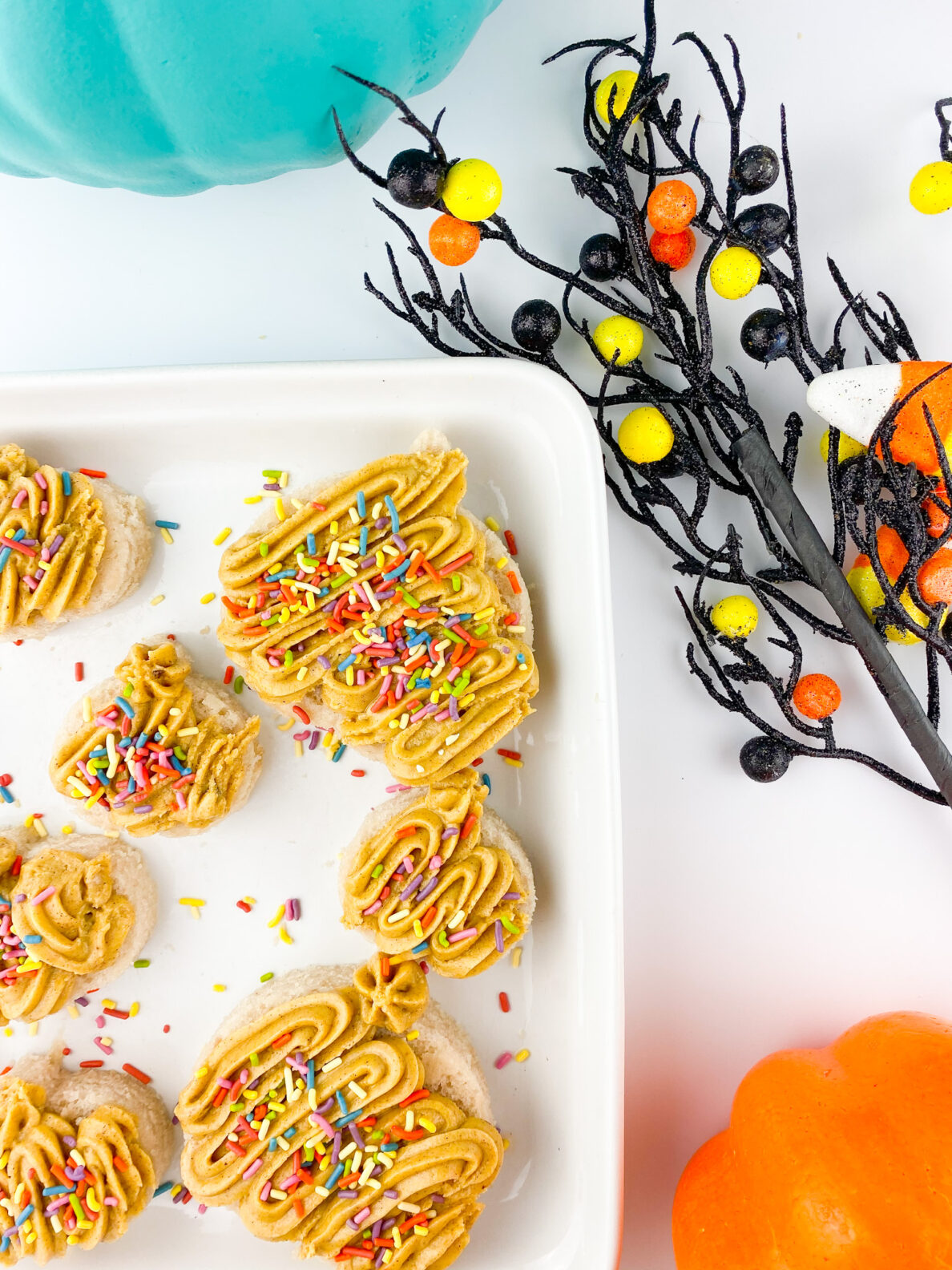 Using a pumpkin shaped cookie cutter (or any shape you’d like to use) cut the cake into shapes. After the cake is cut into your desired shapes use a piping tip and bag and to pipe on the pumpkin spice frosting. Add sprinkles if you’d like!
