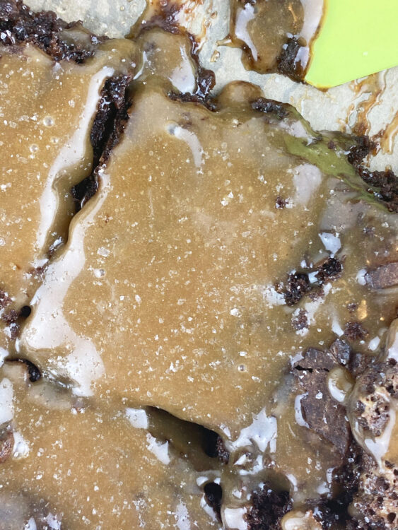 - Remove from oven and allow pan to cool on wire rack for at 30 minutes before topping with the remaining caramel and sprinkle immediately with 1/4 tsp sea salt.